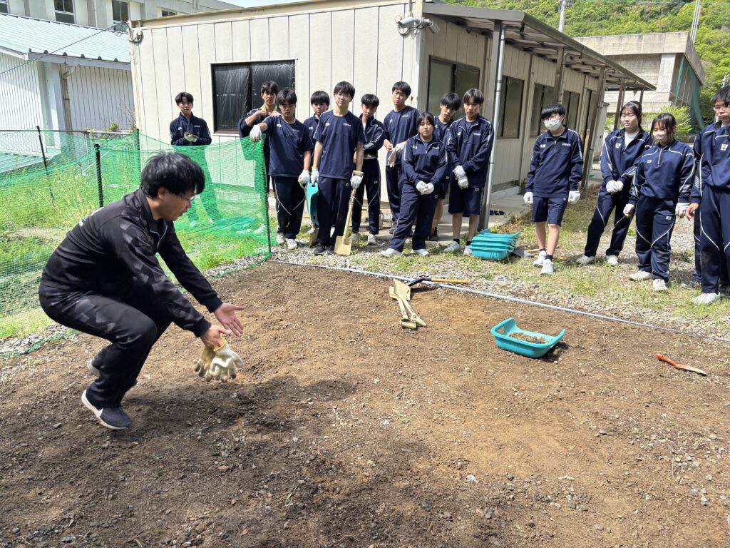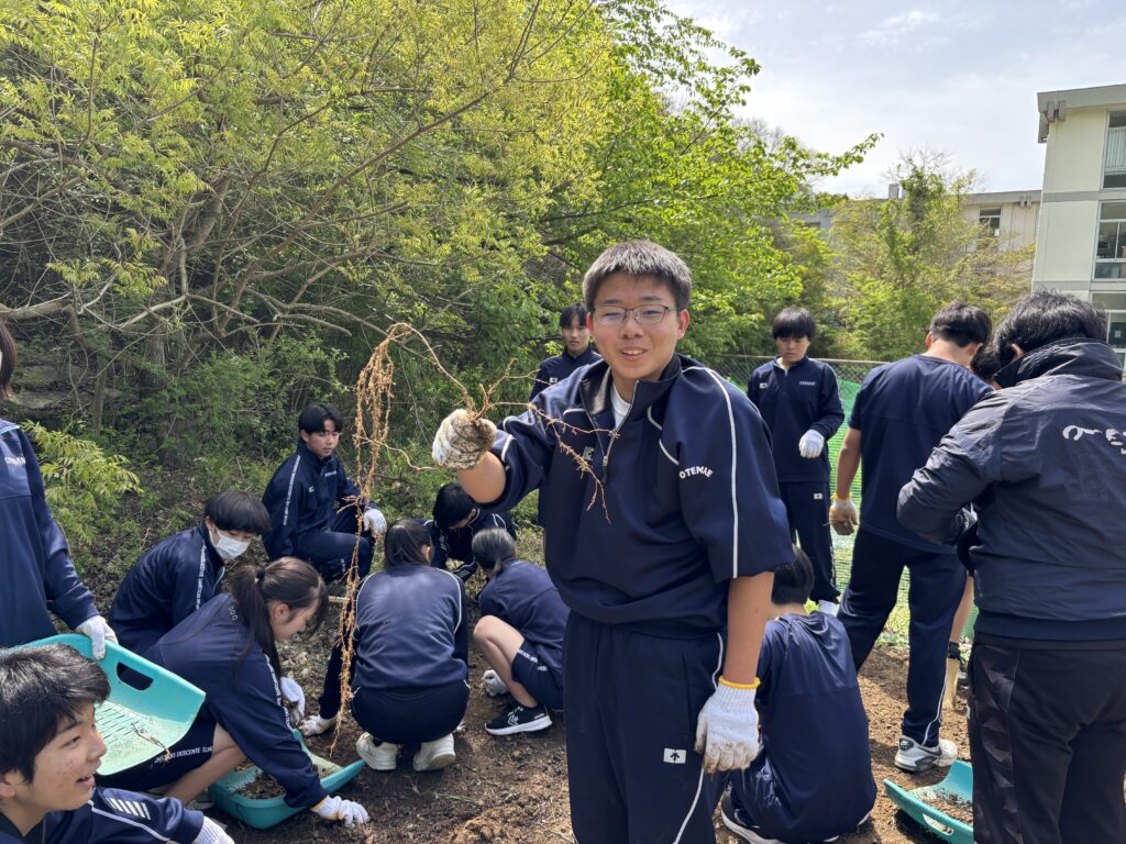 高校1年3組(未来探究 i コース1期生)は、本日オリエンテーションのあと、何もない土地から石や雑草を取り除き、備中鍬で土を耕す作業に取り組みました。土が固く作業は容易ではありませんでしたが、何もない状態から畑をつくり上げていく「0から1を生み出す過程」を実感する貴重な機会となりました。