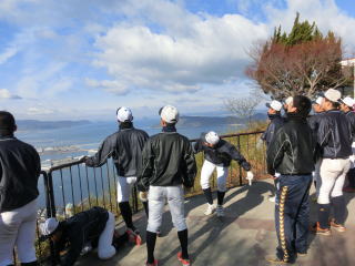 今日が練習始めとなり、はじめにミーティングを行い、今年の目指すべきチームの方針を話し、全員で意思疎通を行いました。そして毎年恒例になっていますが、屋島寺へ初詣に参りました。今年は全員で歩いて参拝しました。その後、グランドへ移動し、整備清掃、ネットの修繕を行い、午後から練習を行いました。昨年末の強化期間が終わってからから1週間近くの休暇明けとなり、全員が生き生きと練習していました。最後にウエイトトレーニングを行い、終了しました。