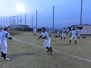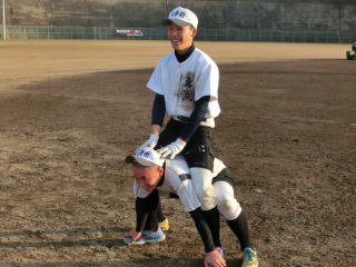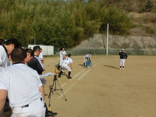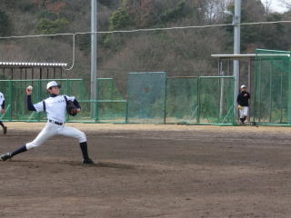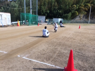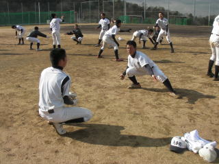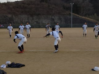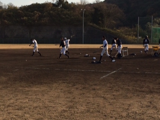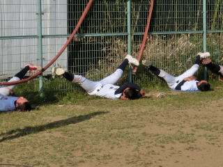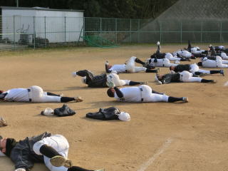 土日はこの時期にしては暖かいため、打撃や守備練習に時間を充てました。今行っている基本練習が、実際に身に付いているか確認し、イメージ通りでなければ各自が修正する必要があると思います。2月には実戦練習がメインとなるため、この時期の基本練習を大切にしていきたいです。練習の最後は時間をかけてストレッチなどのクールダウンです。開脚して頭が地面に付く選手が増えました。胸が付くことが目標です。 |