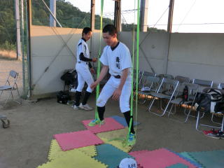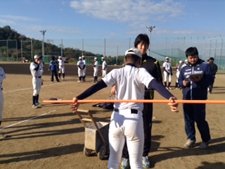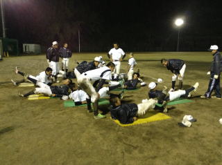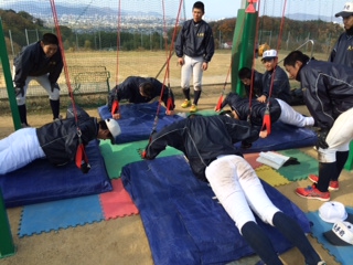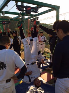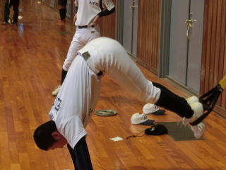振り込み、投げ込み、守備の基礎基本の繰り返しと、野球の動きも増えてきました。股関節の柔軟性が向上し、バットスイングの体重移動がスムーズになってきました。冬季トレーニングを野球の動きにつなげていきたいです。 |