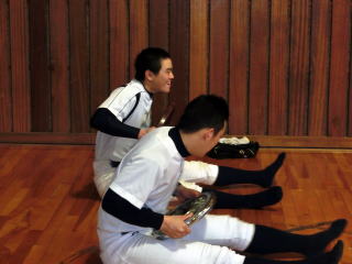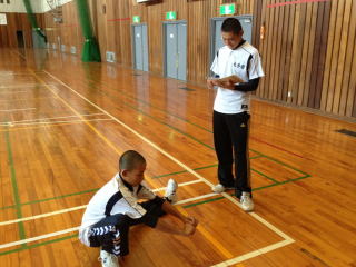 毎週水曜日の朝練はストレッチテストをしています。下半身、上半身それぞれ測定し、柔軟性のチェックをします。ケガの予防にもつながりますが、柔軟性の向上の意識付けが目的です。 |