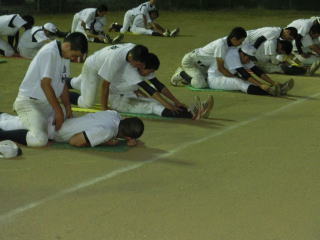 ストレッチのテストをしました。チームの3分の1は自力で頭が付くようになりましたが、まだまだです。各自の努力が必要ではないでしょうか。改善している部員は劇的に変わっています。チームの流れに乗れるように、チームを引っ張れるように、各自の取り組みに期待します。 |