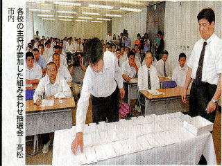 | 夏の高校野球の組み合わせ抽選があり、本校の対戦校が笠田高校に決まりました。47年ぶりの再スタートとなる本校野球部にマスコミの注目も集まっています。試合は、7月18日(日曜)12時30分開始です。多くの方の応援をお願いします。(写真は四国新聞より転載・抽選をする本校・石田主将) |