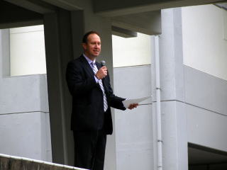 マーク先生のスピーチです。生徒たちは真剣に英語を聴いています。