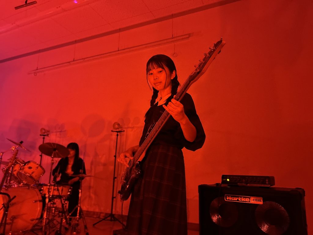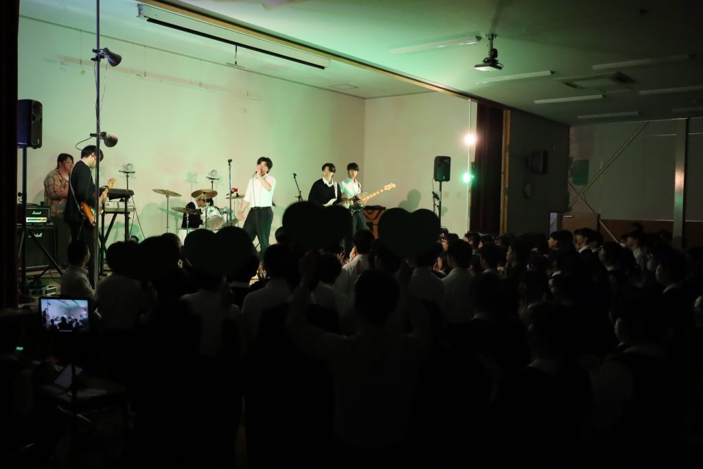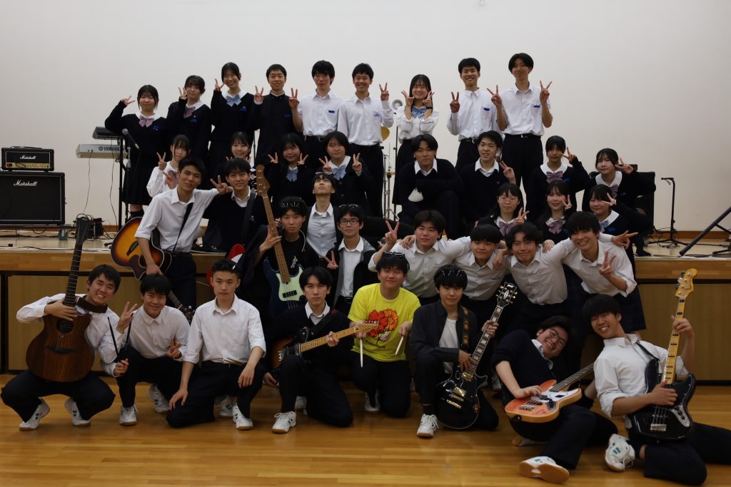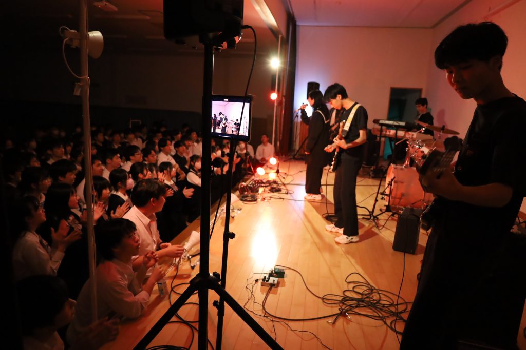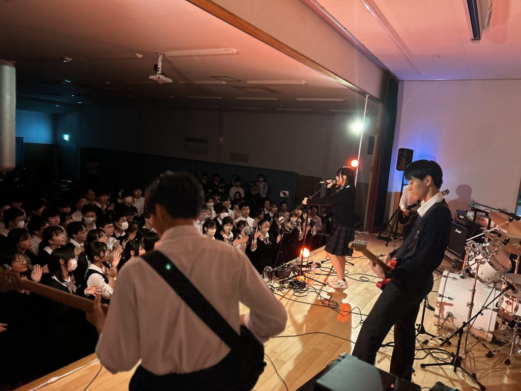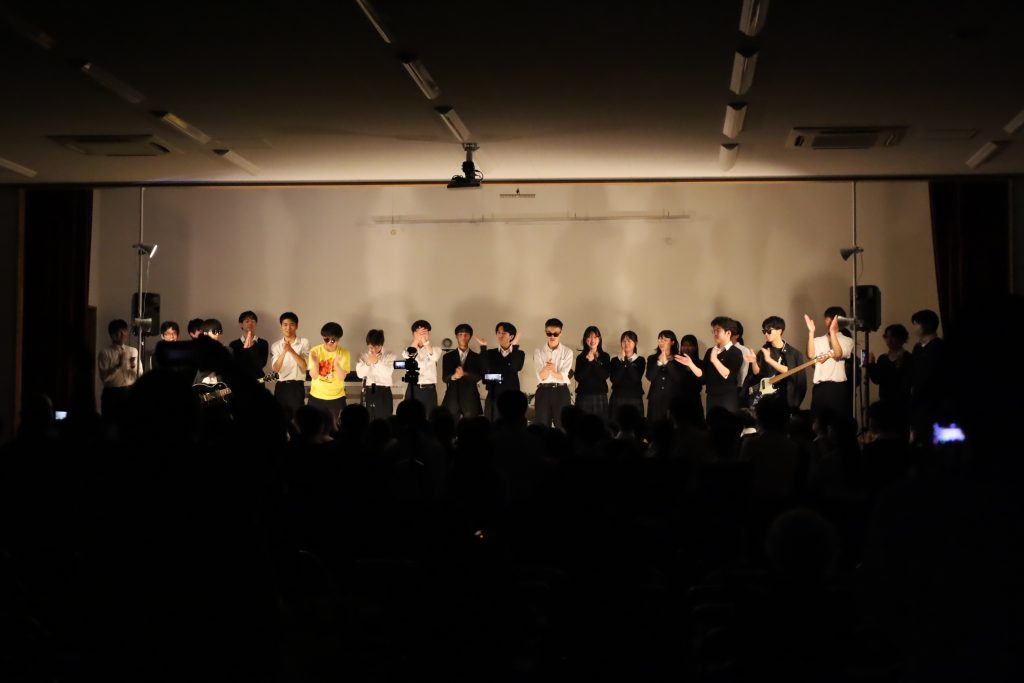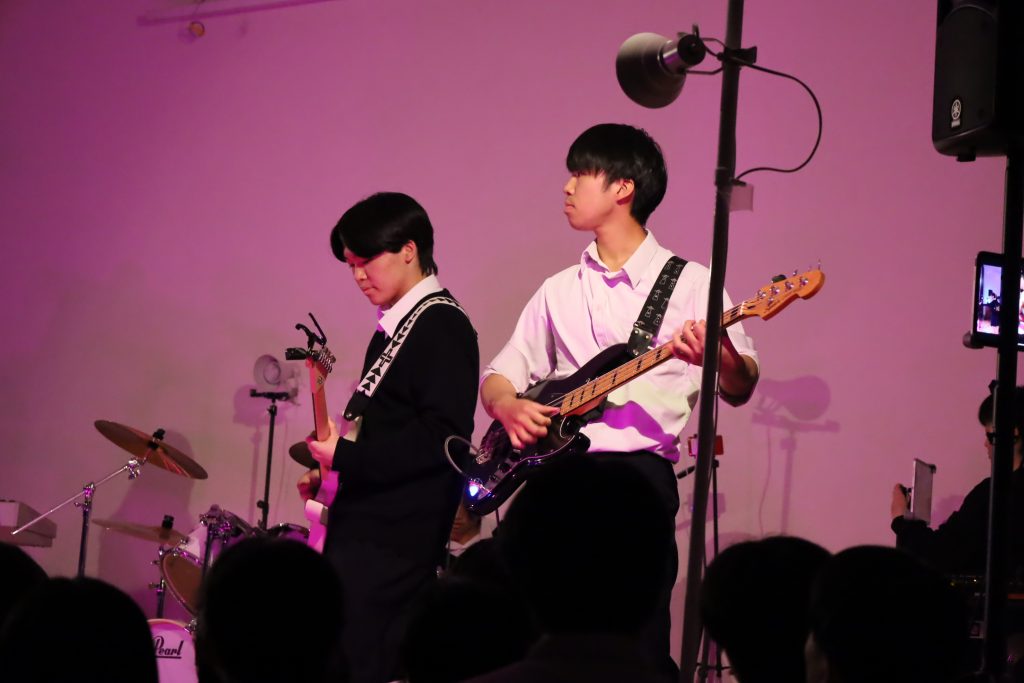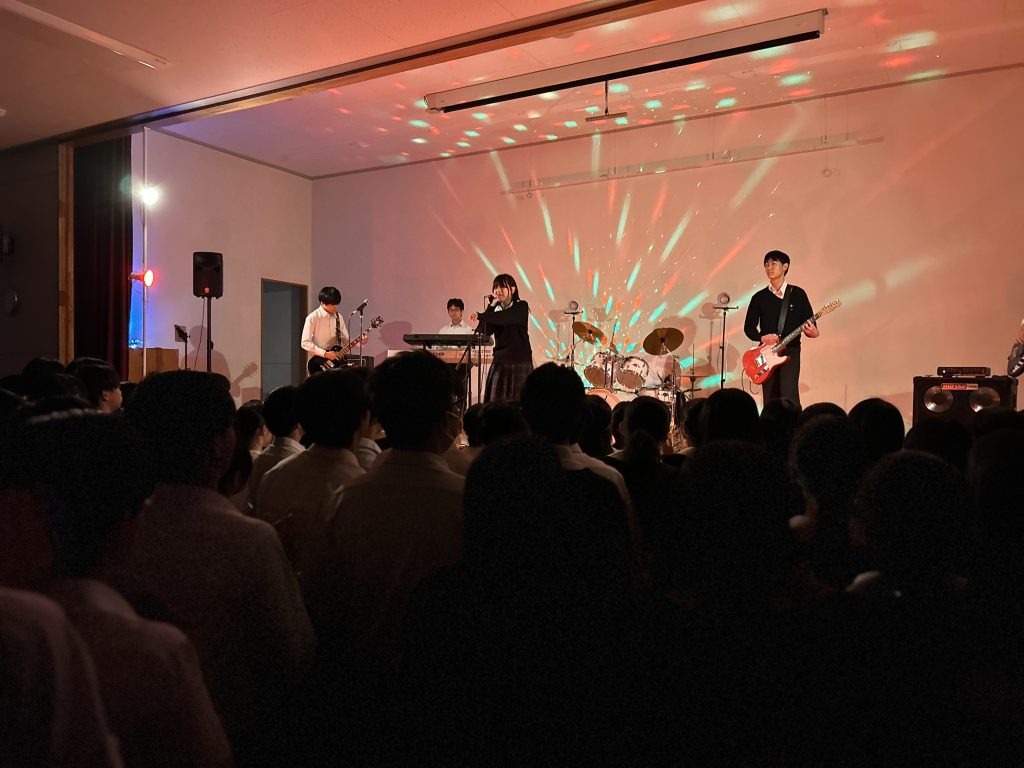 演劇部の照明協力のおかげもあり、演奏が始まると、まるでライブハウスのような空気に包まれ、人気バンドのカバー曲が次々と披露されました。