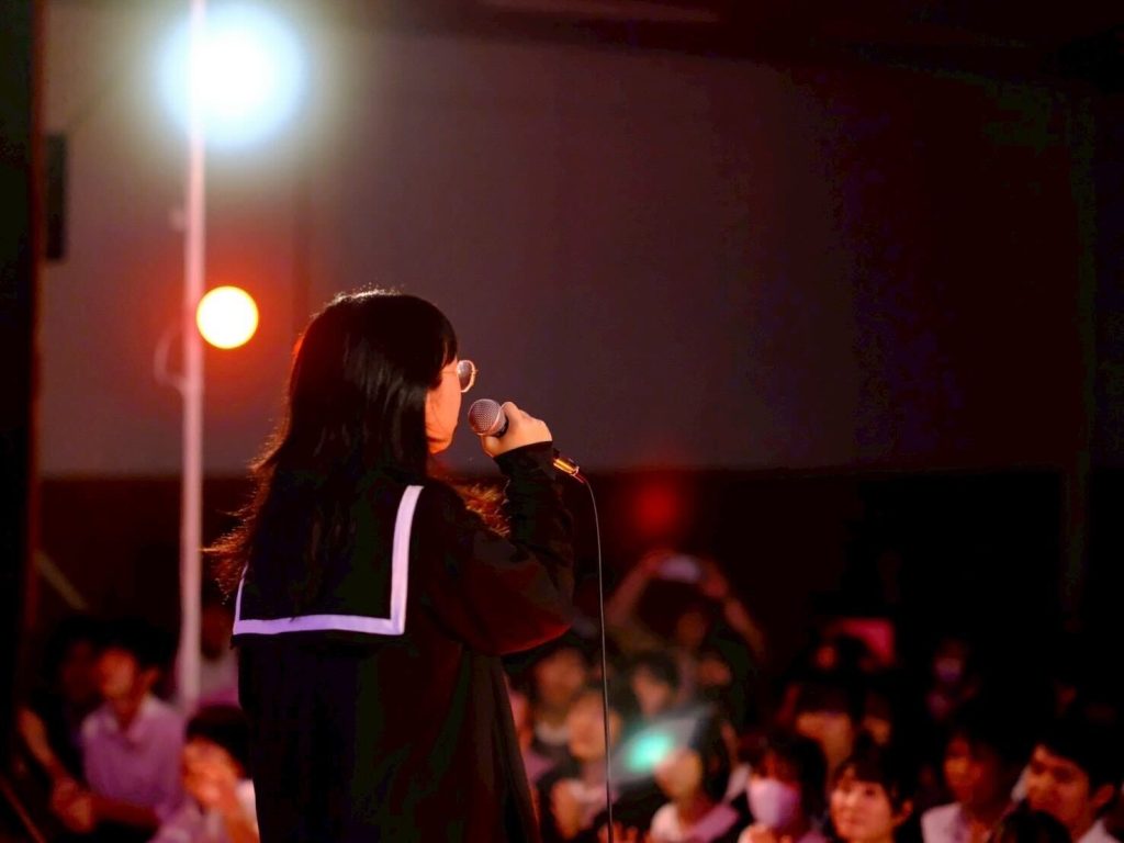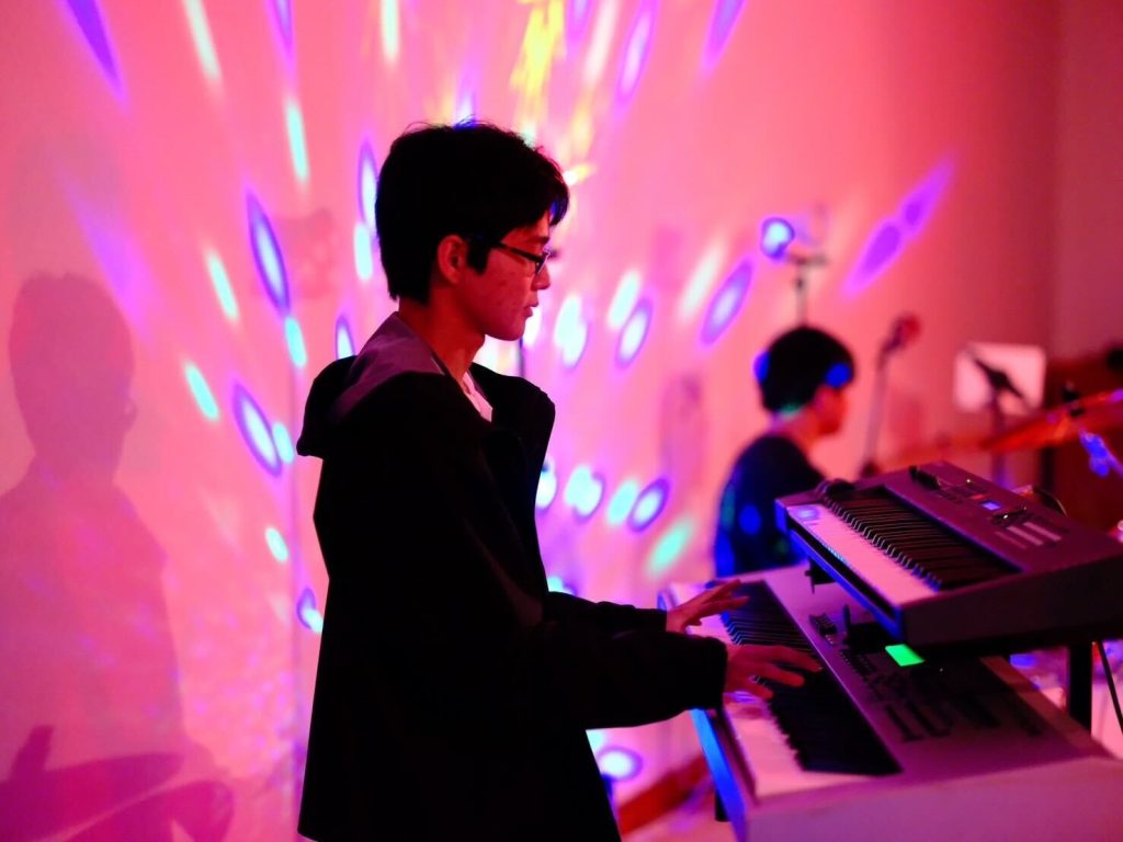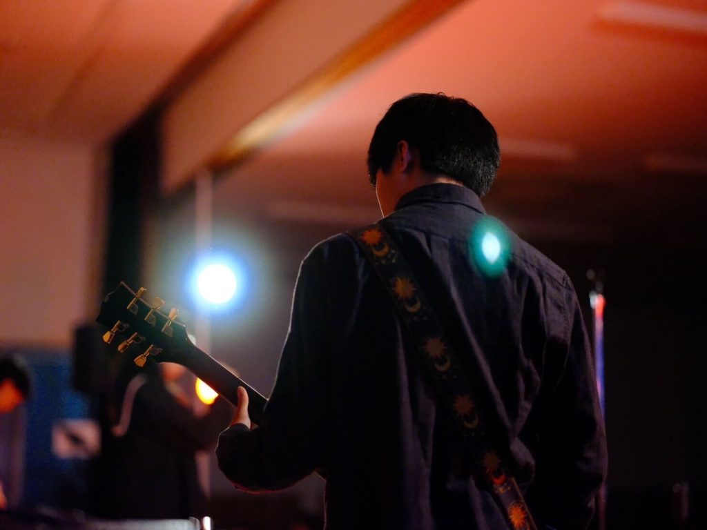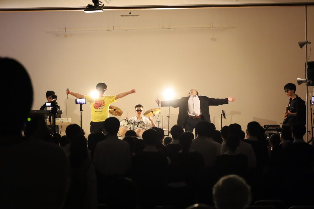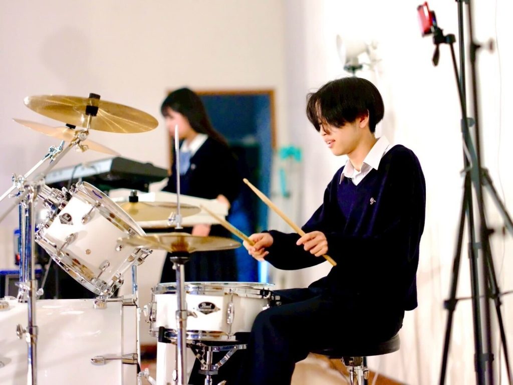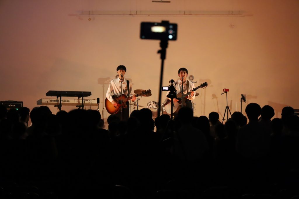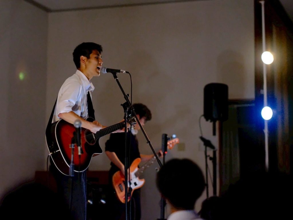 演劇部の照明協力のおかげもあり、演奏が始まると、まるでライブハウスのような空気に包まれ、人気バンドのカバー曲が次々と披露されました。