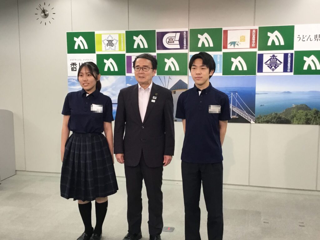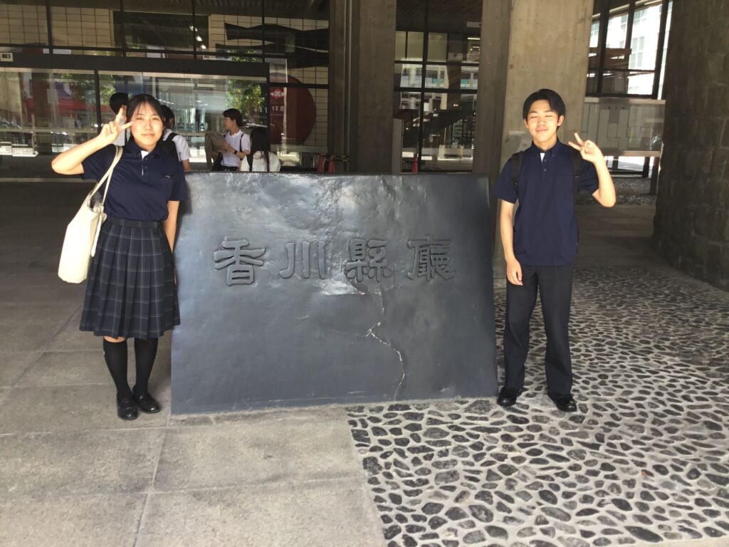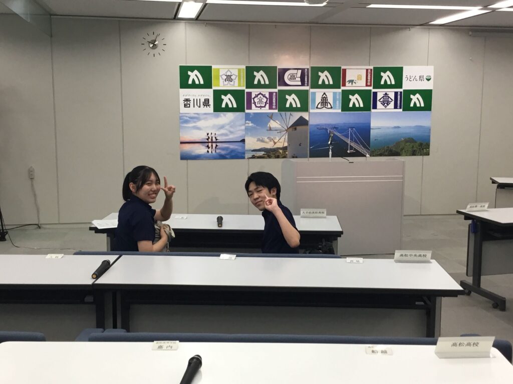 8月6日(水)、「高校生による知事記者会見」が行われ、本校から生徒会長と副会長が参加しました。知事に、①香川県の公共交通機関の充実に向けた具体的な施策について ②卒業後に地元で働く仕組みについて ③南海トラフ地震時の安全対策について の3点の質問をさせてもらいました。トップバッターということもあり、知事からは予定時間を超えて、丁寧で詳細な回答をいただきました。他校からも様々な質問が出され、各校が持つ問題意識や各校の取り組みを聞くことにもなり、また、各校の質問に対する知事の回答を聞き、出席してくれた二人には十分な刺激もあり、「お土産」もできたことと思います。今日の成果については、生徒会で共有してくれるそうです。二人ともお疲れ様でした。