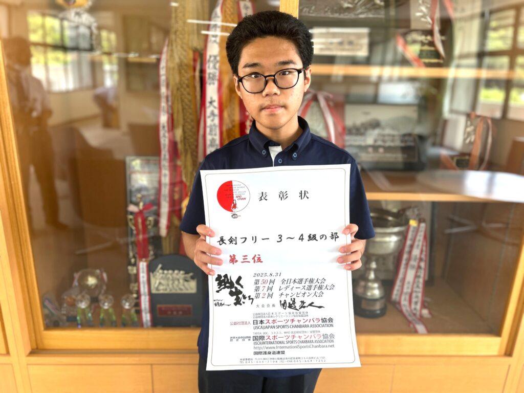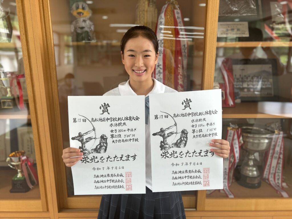 表彰【スポーツチャンバラ、水泳】 2025.09.11 【スポーツチャンバラ】第57回 全日本選手権大会長剣フリー 3~4級の部 第三位 【水泳】第17回高松地区中学校体育大会女子100メートル平泳ぎ 第1位 女子200メートル平泳ぎ 第2位