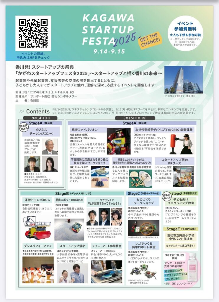 県主催のかがわスタートアップフェスタ2025が9/15(月・祝)サンポート高松にて行われます。起業を身近に感じることができるようになるためのイベントです。本校の生徒・卒業生・教員も参加するのでぜひ皆さん見に来てください!