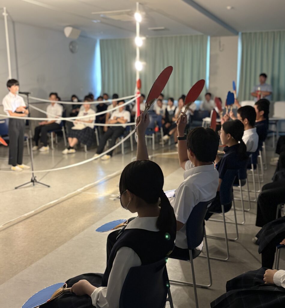判定を務めたのは中学1年生。朗読を聞いた後、「心に響いた」と感じたチームの色のうちわを挙げて投票します。会場は真剣な静けさに包まれる場面もあれば、思わず笑みがこぼれる場面もあり、朗読のたびに緊張と期待が交錯しました。