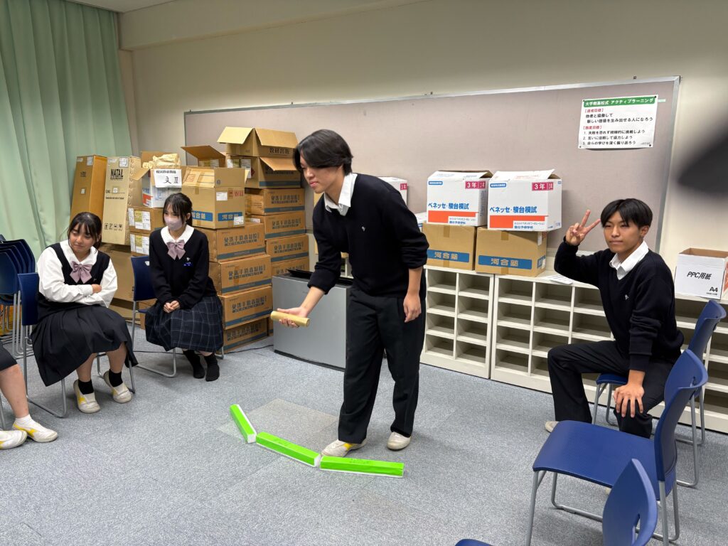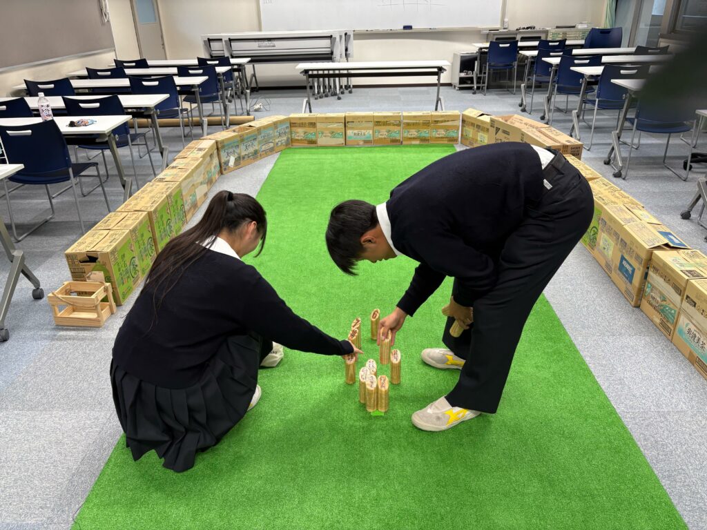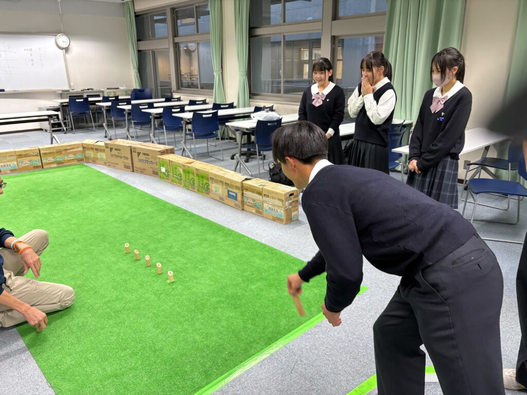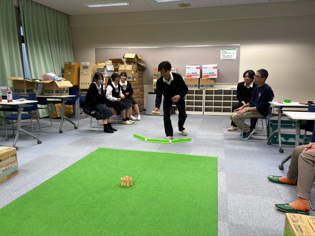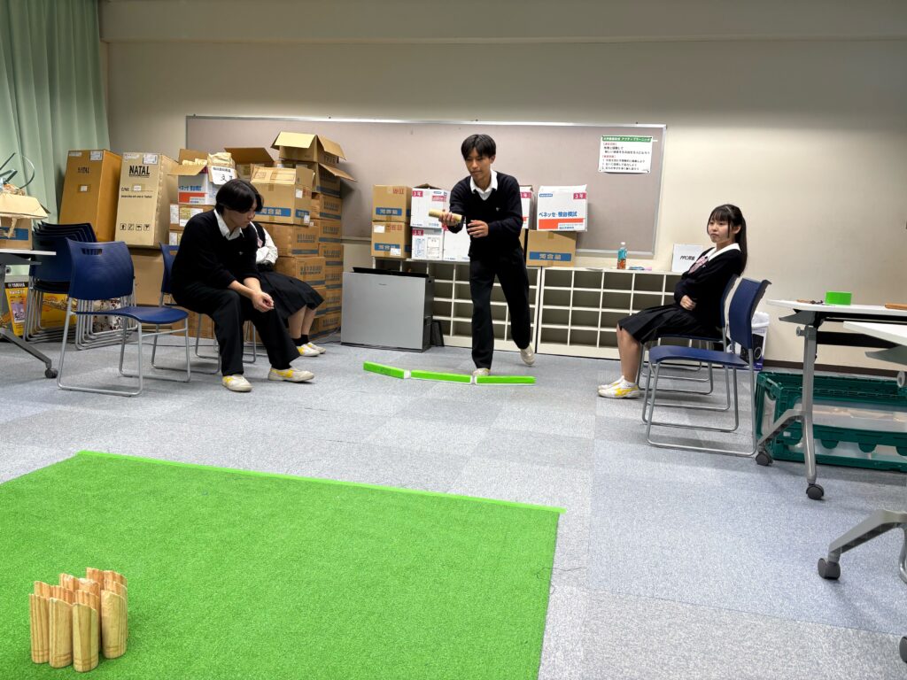 10/23(木)放課後、共生社会実現を目指すモルック体験会の会を行いました。参加生徒全員がモルック初心者という中で始めましたが、シンプルなルールと奥深い戦略にすぐにのめり込んでいました。老若男女問わず誰とでも楽しめるモルックを通して、共生社会の実現を目指すきっかけ作りが出来ました。