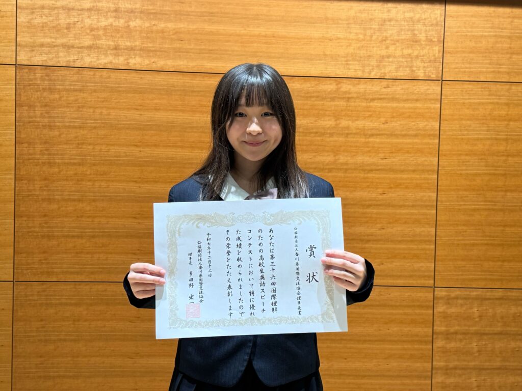 第36回国際理解のための高校生英語スピーチコンテストの英語スピーチの部で高1生が第3位の公益財団法人香川県国際交流協会理事長賞を受賞しました。