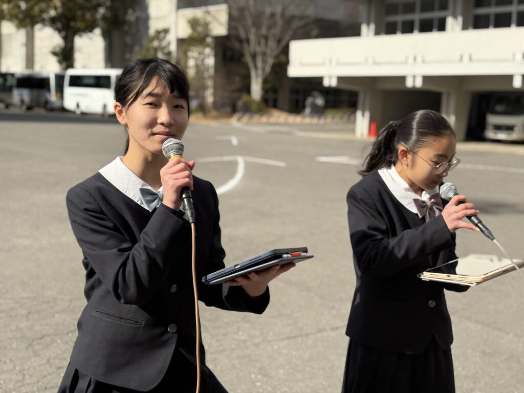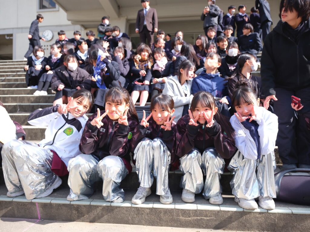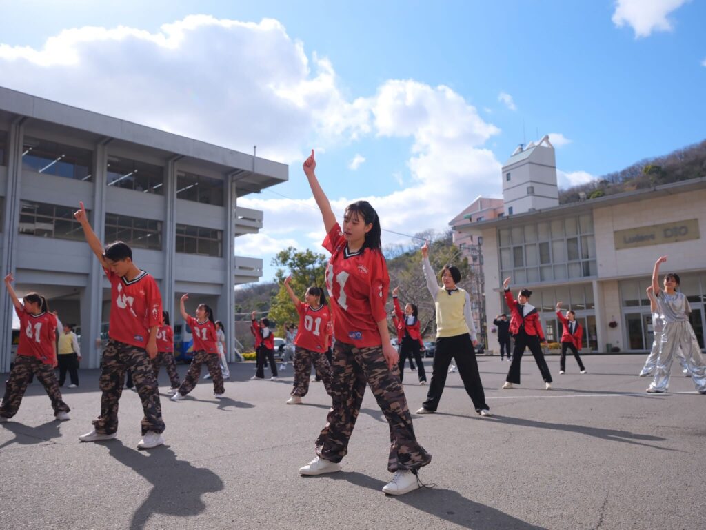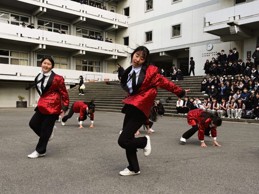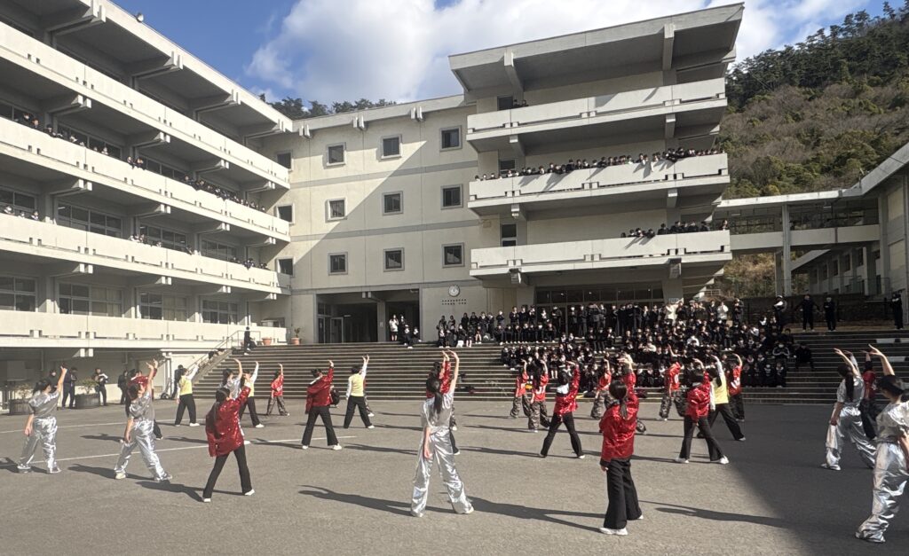 冬の冷たい空気が広がる中、多くの生徒が中庭に集まり、迫力あるパフォーマンスに見入っていました。