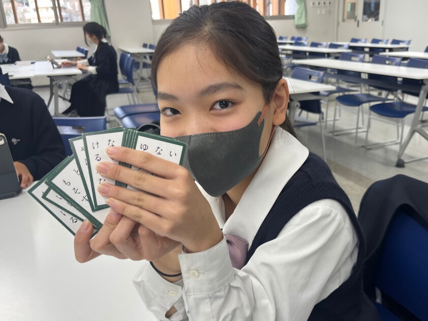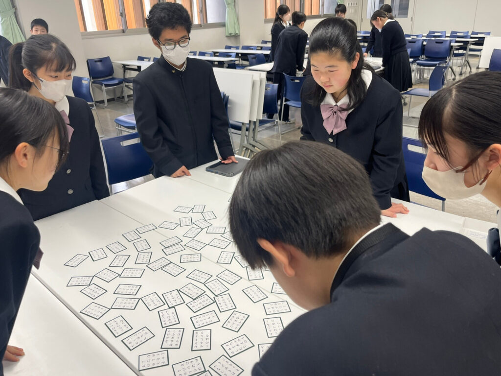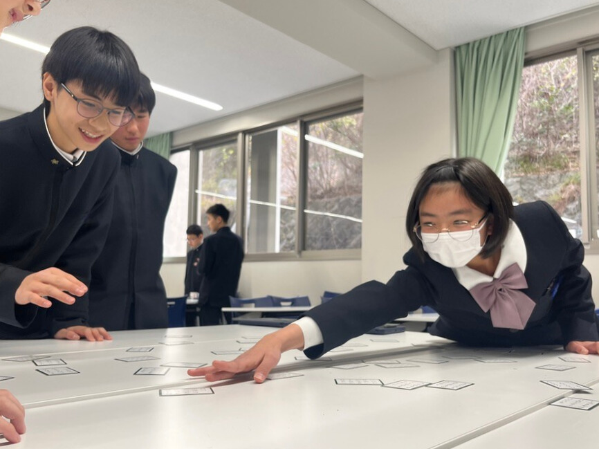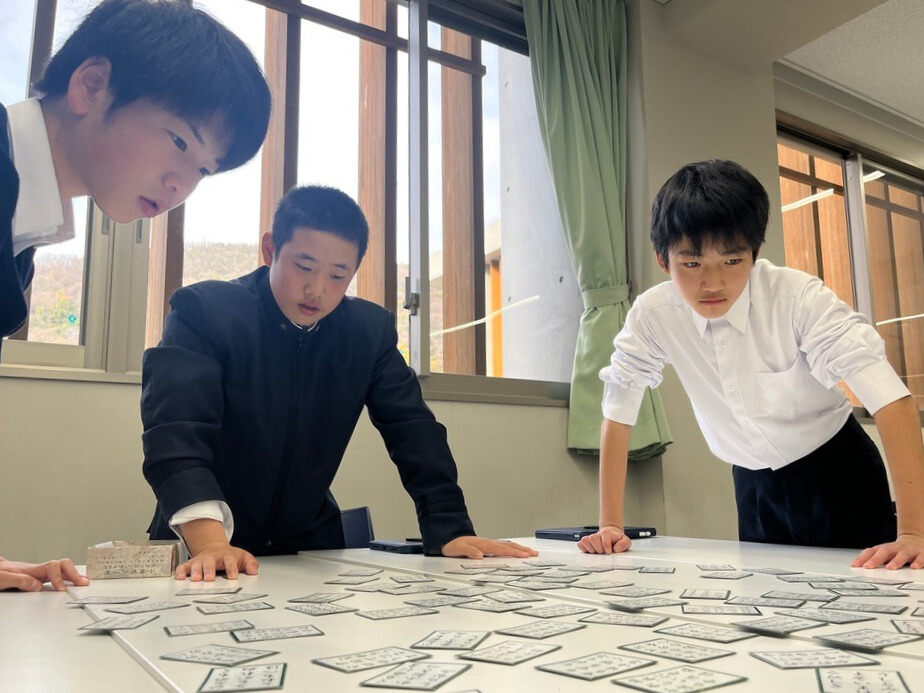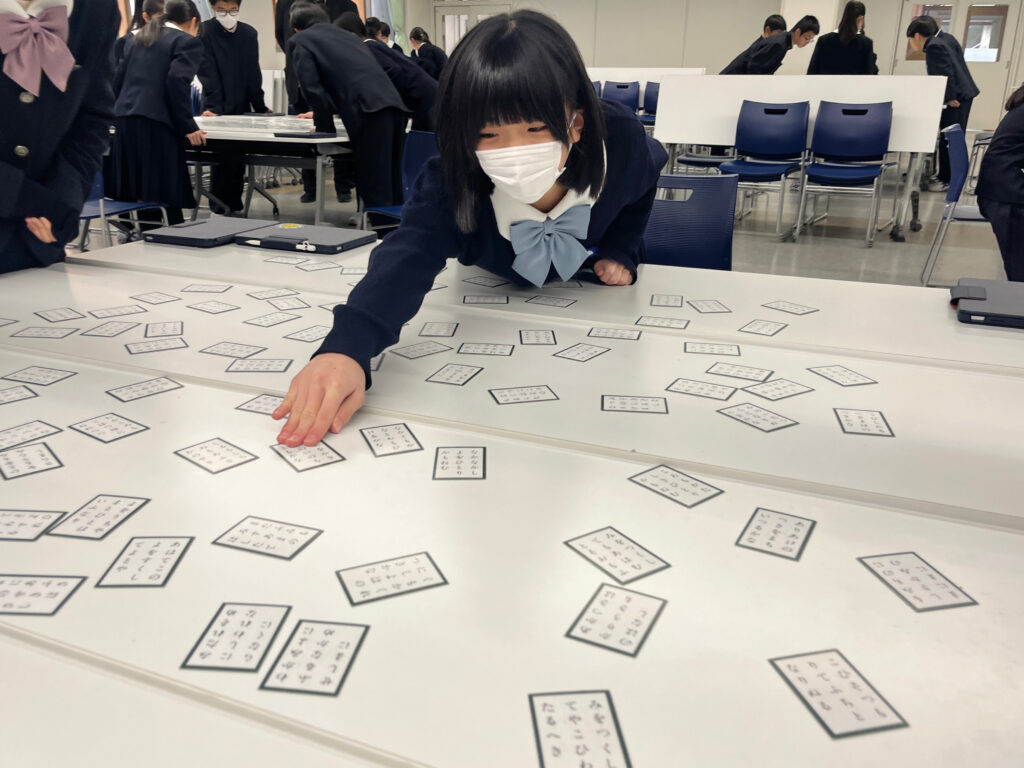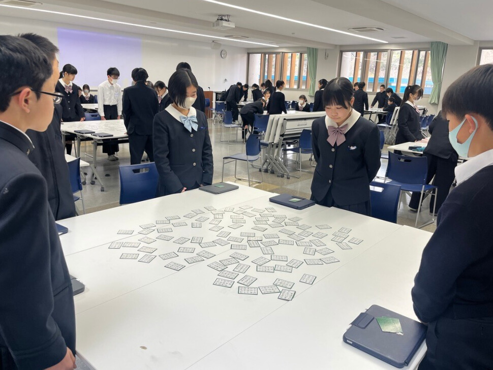 中学1年生が百人一首クラスマッチを行いました。これまでの授業の中で、札の位置や歌のリズムを覚えながら何度も練習を重ねてきた生徒たちは、その成果を発揮しようと真剣な表情で試合に臨みました。読み札が詠まれるたびに会場には緊張感が走り、素早く札に手を伸ばす姿や、惜しくも取れずに悔しがる声があちこちから聞こえてきました。