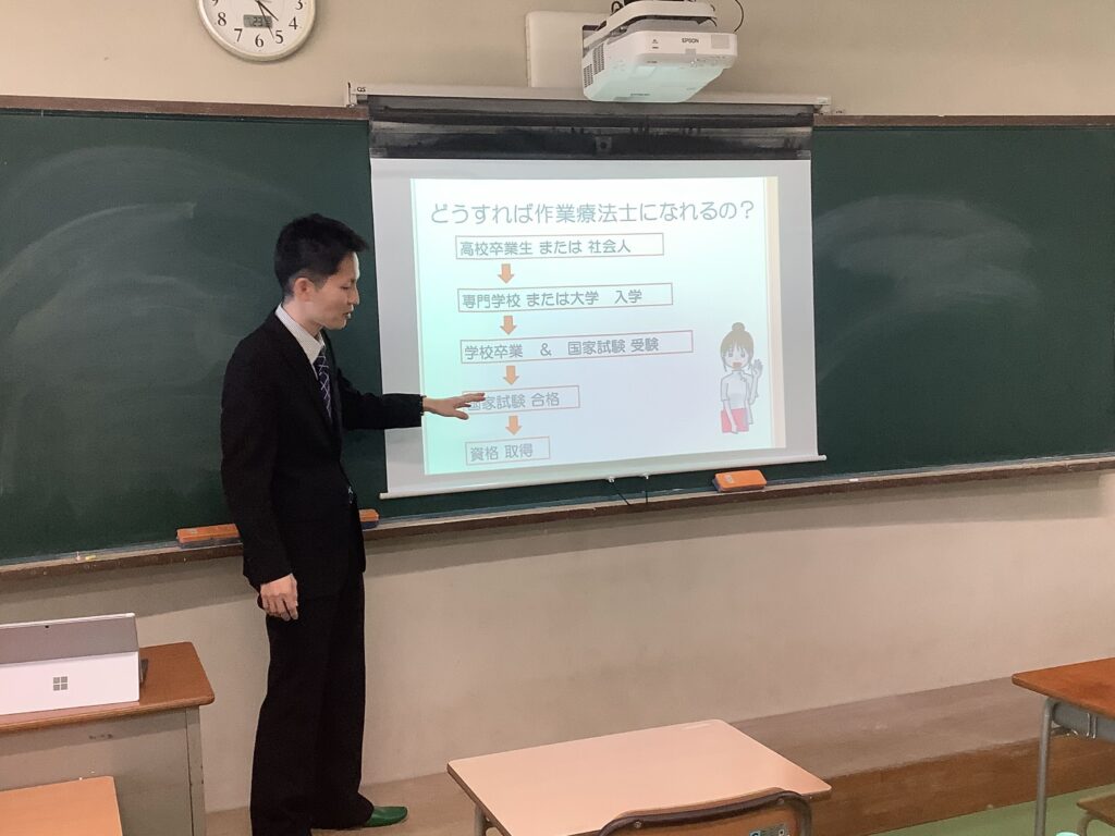 講話では,作業療法士になるまでのプロセスや,日々どのような仕事をしているのかといった具体的な仕事内容に加え,理学療法士との違いについても,実例を交えながらわかりやすく解説していただきました。生徒たちは,医療現場で実際に求められる役割や専門性の違いを知ることで,これまで曖昧だった職業イメージがよりはっきりした様子でした。